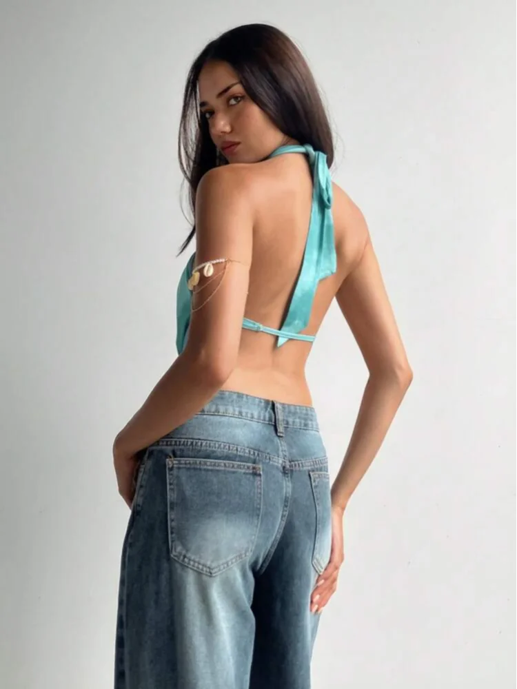 BLUE HALTER VESTIDOS CHIC SHELL FANSCY TOP